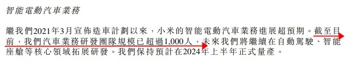 而今年3月,小米集团公布了2021年全年业绩报告,从智能电动汽车业务来看,报告中披露,继2021年3月宣布造车计划以来,小米汽车业务研发团队规模已经超过1000人,未来将继续在自动驾驶、智能座舱等核心领域拓展研发,保持预计在2024年上半年正式量产。