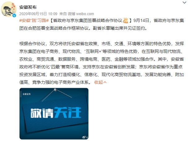 据了解,早在2020年6月,京东集团与安徽省人民政府签署战略合作协议,双方在互联网与现代物流、农牧业、商贸流通、数据服务、跨境电商、医药、金融等领域加强合作。