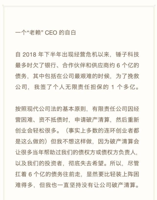 在文章中,罗永浩自述,从2018年下半年出现经营危机开始,锤子科技欠了诸多债主约6个亿的债务,其中包括他个人担保的一个多亿。在过去的十个月中,已经偿还了3个亿左右的债务。