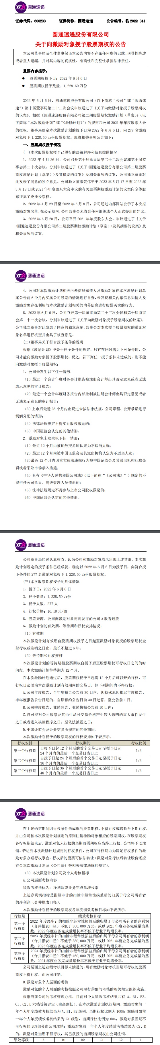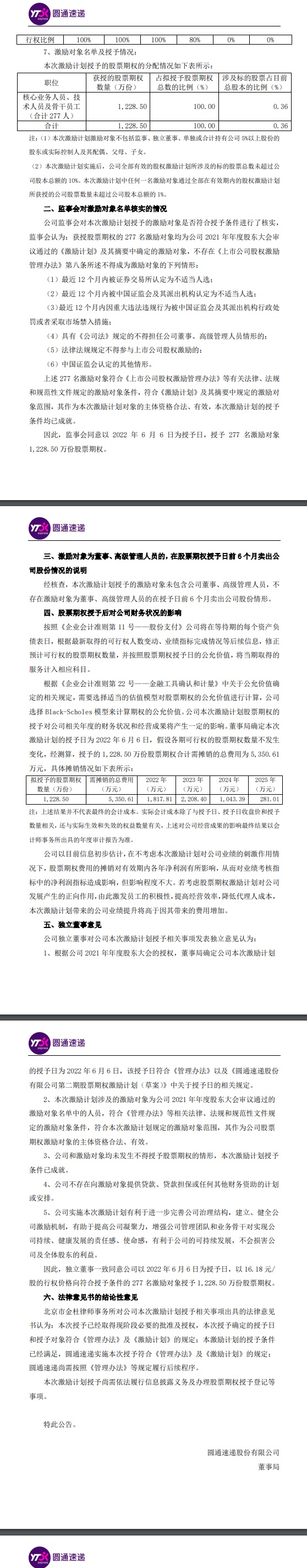 公告称,2022年6月6日,公司第十届董事局第二十三次会议审议通过了《关于向激励对象授予股票期权的议案》,根据《圆通速递股份有限公司第二期股票期权激励计划(草案)》(以下简称本次激励计划或《激励计划》)的规定和公司2021年年度股东大会的授权,董事局确定本次激励计划的授予日为2022年6月6日,向277名激励对象授予1,228.50万份股票期权。
