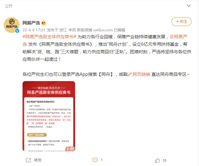 6月7日消息,日前,网易严选发布《网易严选致全体供应商书》,推出“同舟计划”,设立6亿元专用扶持基金,帮助解决“货、钱、路”三大难题,助力供应商回归“正轨”。