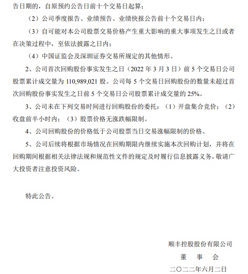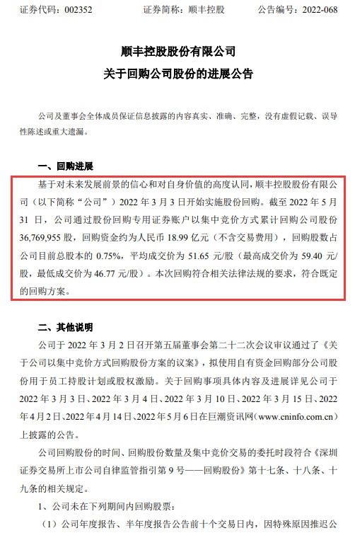 顺丰控股近日还发布关于回购公司股份的进展公告,截至2022年5月31日,公司通过股份回购专用证券账户以集中竞价方式累计回购公司股份36,769,955股,回购资金约为人民币18.99亿元(不含交易费用),回购股数占公司目前总股本的0.75%,平均成交价为51.65元/股(最高成交价为59.40元/股,最低成交价为46.77元/股)。