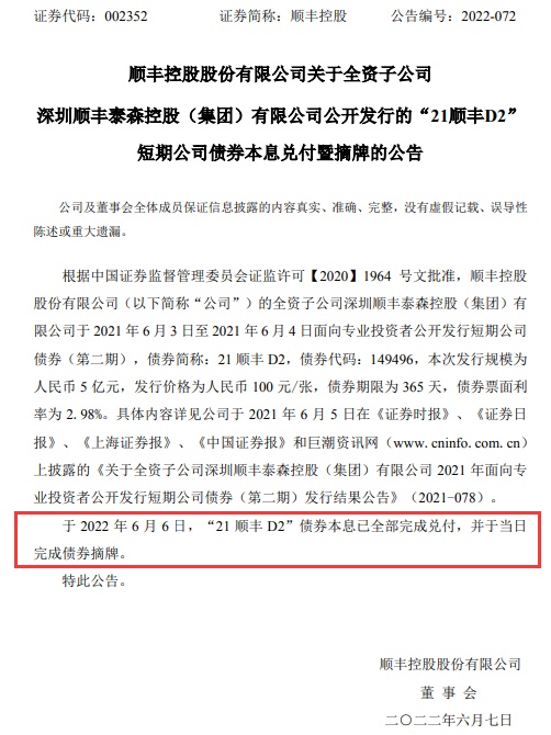 公告显示,于2022年6月6日,“21顺丰D2”债券本息已全部完成兑付,并于当日完成债券摘牌。