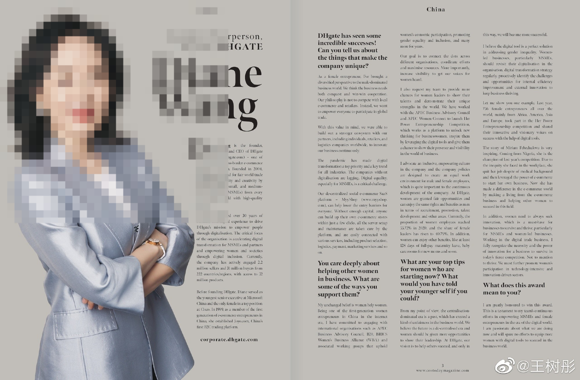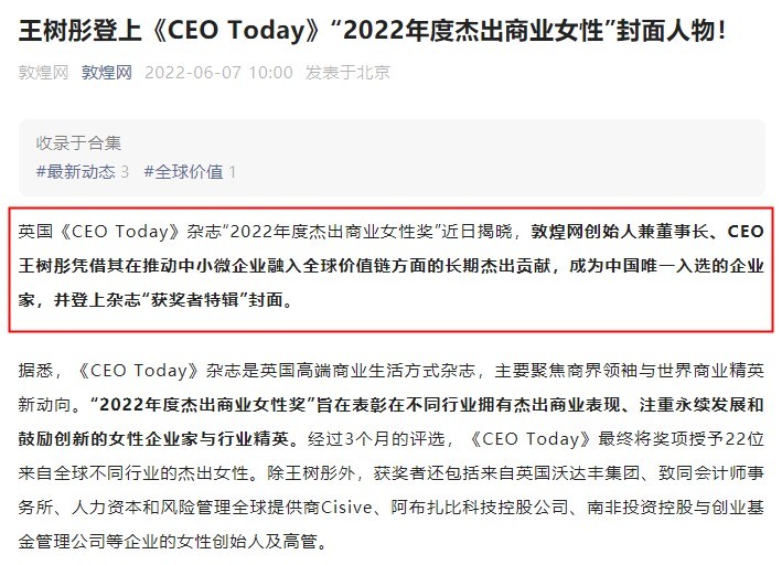 6月7日消息,据敦煌网官微消息,近日,英国《CEO Today》杂志“2022年度杰出商业女性奖”揭晓,敦煌网创始人兼董事长、CEO王树彤凭借其在推动中小微企业融入全球价值链方面的长期杰出贡献,成为中国唯一入选的企业家,并登上杂志“获奖者特辑”封面。