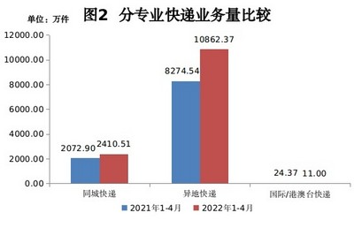 其中,4月份,贵州省快递服务企业业务量完成3419.73万件,同比上升19.32%;业务收入完成5.10亿元,同比上升2.93%。