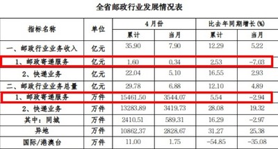 其中,4月份,贵州省邮政服务业务总量完成2.21亿元,同比上升4.86%。邮政寄递服务业务量完成0.35亿件,同比下降2.94%;邮政寄递服务业务收入完成0.34亿元,同比下降7.03%。