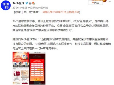 6月8日消息,据Tech星球独家报道,近日,腾讯、抖音开始谋划布局新的种草业务。报道称,腾讯正在测试名为“企鹅惠买”的种草项目,该产品集“本地、种草、社群”等属性为一身,是由腾讯地方站联动腾讯合作品牌的种草平台。值得一提的是,腾讯前不久才下架种草电商平台“小鹅拼拼”。