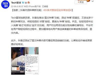 此外,抖音还测试了图文种草内容可悬挂商品链接的功能,以帮助创作者或商家更好地带货。据一位接近字节的人透露,当前,抖音高层对于种草的迭代进程仍感到过慢,意味着接下来,抖音对种草功能的研发还将持续发力。