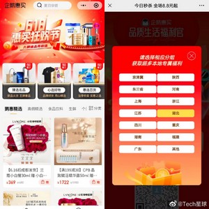 “企鹅惠买”已开通京津冀、东三省、广东、浙江、上海等14个地区分组,不同地区的用户只能进入所在地区的购物群,平台方人员会在群内进行精细化的运营,比如每日分享折扣商品等。
