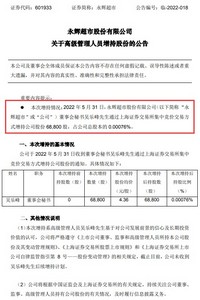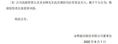 永辉超市近日还发布关于高级管理人员增持股份的公告,2022年5月31日,公司董事会秘书吴乐峰先生通过上海证券交易所集中竞价交易方式增持公司股份68,800股,占公司总股本的0.00076%。