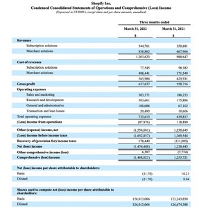 5月份,加拿大电商Shopify公布了其截至2022年3月31日的第一季度财报。财报数据显示,该公司第一季度总营收为12.04亿美元,不及市场普遍预计的12.4亿美元,上年同期为9.89亿美元,同比增长22%。与该公司在2021年第一季度110%的营收增长率相比,大幅下滑。此外,Shopify第一季度商品总额(GMV)为432亿美元,比2021年第一季度增加59亿美元,增长率为16%,不及市场预期的465亿美元。