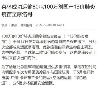 菜鸟分批次运输80吨100万剂国产13价肺炎疫苗 已成功抵达摩洛哥