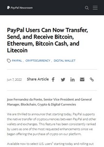 6月8日消息,日前,PayPal发布公告称,从6月7日开始,PayPal支持在PayPal与其他钱包和交易所之间传输加密货币。该功能是自平台上提供购买加密货币以来,一直被用户列为最需要升级的功能之一。