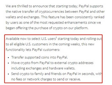 与此同时,符合条件的美国用户从今天开始可使用该功能,PayPal将在未来几周内向所有符合条件的美国客户推出。这项新功能可将支持的硬币转移到PayPal;将加密从PayPal转移到外部加密地址,包括交易所和硬件钱包;在几秒钟内通过PayPal向家人和朋友发送加密货币,发送或接收不收取任何费用或网络费用。