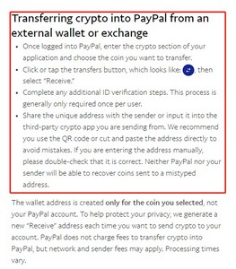 具体来看,用户从外部钱包或交易所将加密货币转移到PayPal,用户在登录PayPal后,进入应用程序的加密部分并选择要转移的硬币;再单击或点击“传输”按钮;然后选择“接收”;完成所有其他身份验证步骤,这个过程一般每个用户只需要一次。