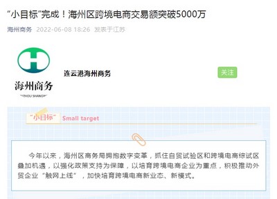 6月9日消息,日前, “海州商务”官微发布消息称,截至目前,根据连云港市跨境电商点点通公共服务平台反馈数据,2022年海州区跨境电商交易额为5566.52万元,已完成全年目标任务159%。