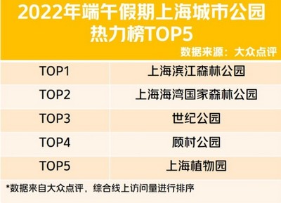 其中,上海滨江森林公园、上海海湾国家森林公园、世纪公园、顾村公园、上海植物园成为在线热力值TOP5的游园好去处。大众点评数据显示,滨江森林公园的线上热度环比上周同期上涨了154倍。