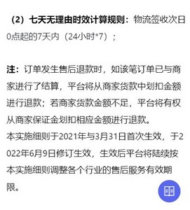而七天无理由时效计算规则是物流签收次日0点起的7天内(24小时*7)。