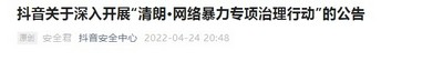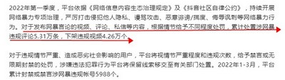 值得一提的是,此前,抖音发布了关于深入开展“清朗·网络暴力专项治理行动”的公告。公告称, 2022年第一季度抖音累计下架违规视频4. 26万个,封禁或禁言涉网暴违规帐号5988个。