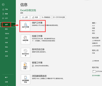 2、单击【文件】后,,找到【信息】选项,并单击它,找到【信息】选项页面的【保护工作簿】选项,如下图所示。