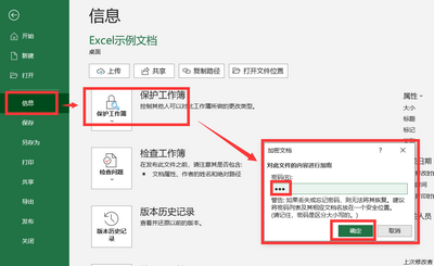 还是单击【文件】,找到【信息】选项下的【保护工作簿】,再往下找到【用密码加密】选项,如下图所示。