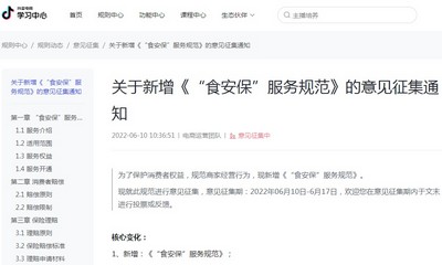 公告称,为了保护消费者权益,规范商家经营行为,现新增《“食安保”服务规范》。现就此规范进行意见征集,意见征集期2022年06月10日-6月17日。