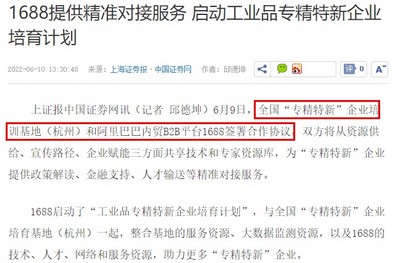 6月10日消息,据上海证券报报道,6月9日,全国“专精特新”企业培训基地(杭州)和阿里巴巴内贸B2B平台1688签署合作协议,双方将从资源供给、宣传路径、企业赋能三方面共享技术和专家资源库,为“专精特新”企业提供政策解读、金融支持、人才输送等精准对接服务。