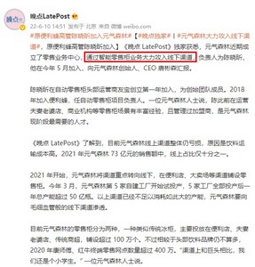 6月10日消息,据《晚点 LatePost》独家获悉,元气森林近期成立了零售业务中心,通过智能零售柜业务大力攻入线下渠道,负责人为陈晓昕,他在今年5月加入,向元气森林创始人、首席执行官(CEO)唐彬森汇报。