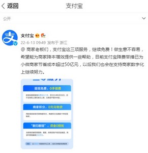 去年,人民银行等四部委发布关于降低小微商户支付手续费的通知,中国支付清算协会等行业协会也发出降费倡议,支付宝率先响应,并提前两个月推出提现免费、网络支付服务费打折等举措,半年来已为商家节省成本超过50亿元。