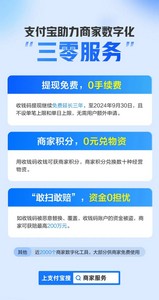 6月13日消息,支付宝开放平台微信公众号发布消息称,支付宝面向小微商家推出“三零服务”,平台通过提现免费、被盗全赔、免费权益等为小微商家降本提效。
