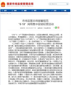 6月13日消息,近日,市场监管总局向全国互联网平台企业和各地市场监管部门发出《关于规范“6·18”网络促销经营活动的工作提示》,进一步规范做好“6·18”网络集中促销活动。