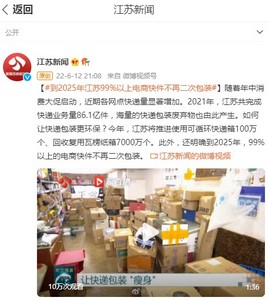 值得一提的是,随着年中消费大促启动,近期各网点快递量显著增加。2021年,江苏共完成快递业务量86.1亿件,海量的快递包装废弃物也由此产生。今年,江苏将推进使用可循环快递箱100万个、回收复用瓦楞纸箱7000万个。此外,还明确到2025年,99%以上的电商快件不再二次包装。