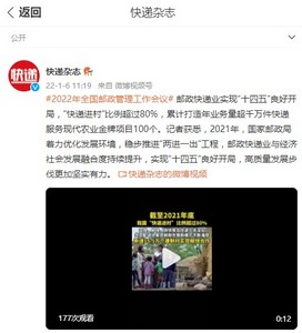今年1月,2022年全国邮政管理工作会议发布的消息显示,邮政快递业实现“十四五”良好开局,“快递进村”比例超过80%,累计打造年业务量超千万件快递服务现代农业金牌项目100个。