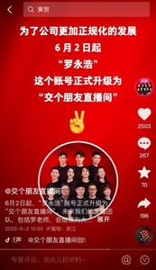 值得一提的是,6月2日,罗永浩抖音账号宣布更名为“交个朋友直播间”,头像也从罗永浩单人照换成了主播合照。并表示,为了公司更加正规化的发展,“罗永浩”这个账号正式升级为“交个朋友直播间”,继续由北京交个朋友数码科技有限公司运营。