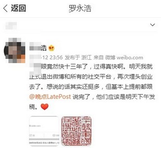 6月12日深夜,罗永浩在微博发文称:“一眨眼竟然快十三年了,过得真快啊。明天我就正式退出微博和所有的社交平台,再次埋头创业去了。”