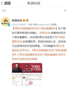 6月13日消息,交个朋友方面今日向新浪科技确认,@罗永浩 微博将改名交个朋友直播间,与此同时罗永浩注册了@产品经理罗永浩 的微博账号,目前已完成认证,还将进行业务相关的交流和辟谣。