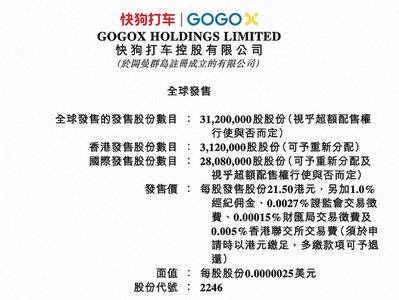 6月14日消息,快狗打车发布公告称,公司已向联交所申请批准已发行股份及根据全球发售将予发行的股份上市及买卖。公司于2022年6月14日至6月17日招股,拟全球发售3120万股股份,其中香港发售占10%,国际发售占90%,另有15%超额配股权。