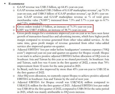 在电商平台业绩上,Shopee 2022年第一季度的GMV为174亿美元,同比增长了38.7%;GAAP收入为15亿美元,同比增长了64.4%;总订单数为19亿,同比增长了71.3%。冬海集团预计,2022年电子商务的GAAP收入为85亿美元-91亿美元,此前预计为89亿美元-91亿美元。
