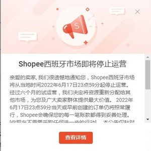 卖家通知页面显示:“经过六个月的试运营,我们决定将资源重新分配给其他市场,为您及广大卖家群体提供最大价值。2022年6月17日23点59分当天或早前创建的订单仍将照常履行,Shopee将确保每一笔账款都得到妥善处理。”