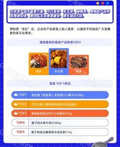 另外,东北菜、湖南菜、粤菜等地方特色美食的预制菜产品受到欢迎,增速较快,其中东北菜增速最快,增长接近6倍。同时,水煮鱼、蒙古奶酪饼、红烧狮子头、北京烤鸭等需要烹饪技巧,往往需要下馆子才能品尝到原汁原味的“功夫菜”预制菜产品也在直播间购买爆火。