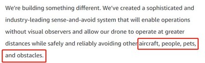 亚马逊表示,其无人机拥有一个“感知和规避系统”,可以帮助它们发现静止和移动的物体,以避免与人、宠物、其他飞行器和障碍物相撞。
