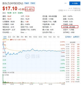 同时,新东方涨超5%,报17.10美元,总市值29.02亿美元。