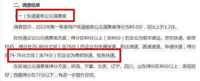 在国家邮政局发布的一季度快递服务公众满意度排名中,按得分分为三个档。其中,极兔速递的得分位于最低档,排名垫底。