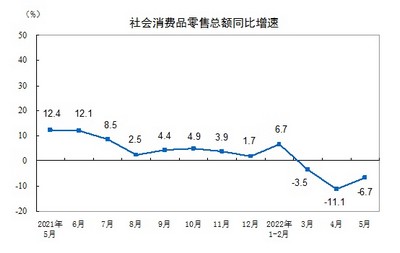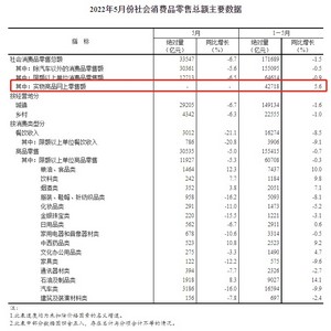 5月份,社会消费品零售总额33547亿元,同比下降6.7%。其中,除汽车以外的消费品零售额30361亿元,下降5.6%。
