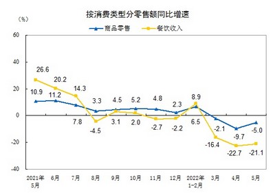 按消费类型分,1—5月份,商品零售155415亿元,同比下降0.7%;餐饮收入16274亿元,下降8.5%。5月份,商品零售30535亿元,同比下降5.0%;餐饮收入3012亿元,下降21.1%。