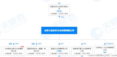 北京大鱼快乐文化传媒有限公司成立于2017年4月,注册资本1000万人民币,法定代表人李巍,经营范围包括:组织文化艺术交流活动;软件开发;企业管理咨询;摄影服务;企业策划;演出经纪;文艺表演;电影发行;出版物批发等。股权穿透图显示,该公司由阿里巴巴文化娱乐有限公司全资持股。