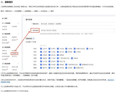 公告提醒,因商家运费模版【发货地】信息为空,导致订单无法判断是否为疫情区域发货订单,为避免疫情区域订单延迟发货扣款商家需尽快检查运费模版,补齐发货地信息。路径:商家后台——物流管理——运费模版——编辑——发货地址——填写。