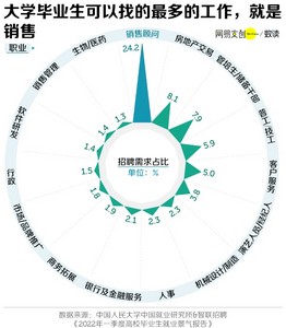 智联招聘的研究显示,2022年,应届生签约就业率与期望薪资均双双降低。一季度,中国所有面向高校毕业生的招聘岗位中,占比最多的就是销售顾问,达到24.2%;招聘需求第二多的岗位是房地产交易,占比8.1%,也与销售相关。再加上占比1.4%的销售管理岗,可以说面向应届生的工作里,有三分之一都是销售。