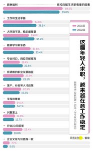 根据《2022大学生就业力报告》,面对低迷的就业环境,与上一届相比,2022届毕业生求职看重的因素中,薪酬福利仍是第一位,但占比已有所下滑。与此同时,毕业生愈发重视工作稳定,看重该因素的人较上一届增加了6.4个百分点。