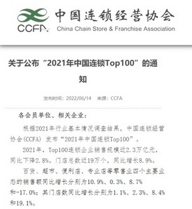 6月15日消息,根据2021年行业基本情况调查结果,日前,中国连锁经营协会(CCFA) 发布“2021年中国连锁Top100”。数据显示,2021年,Top100连锁企业销售规模近2.3万亿元,同比下降2.8%。门店总数近19万个,同比增长8.9%。